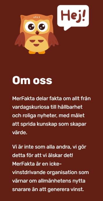 MerFakta delar fakta om allt från vardagskuriosa till hållbarhet och roliga nyheter, med målet att sprida kunskap som skapar värde.